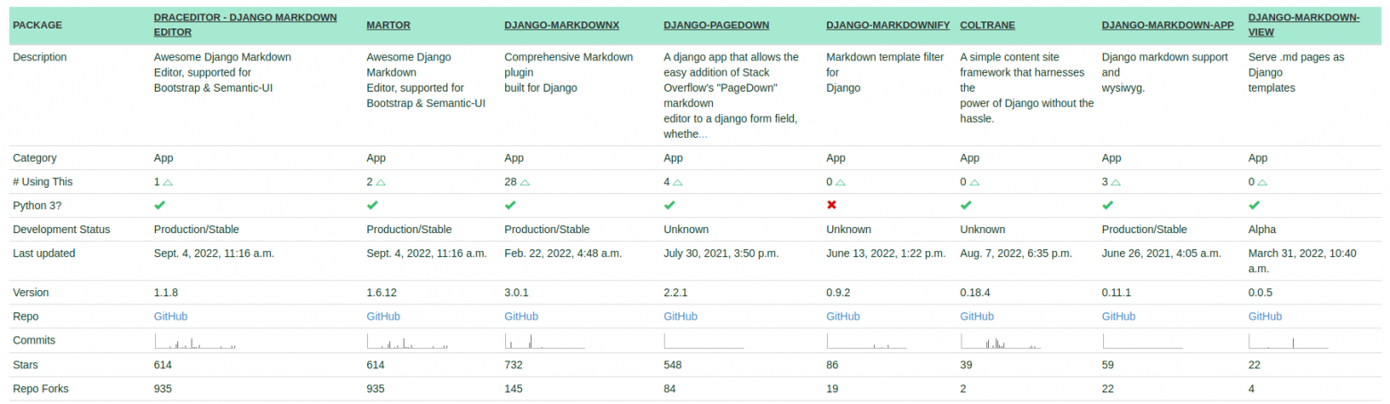 | martor | django-markdownx | django-mdeditor | |