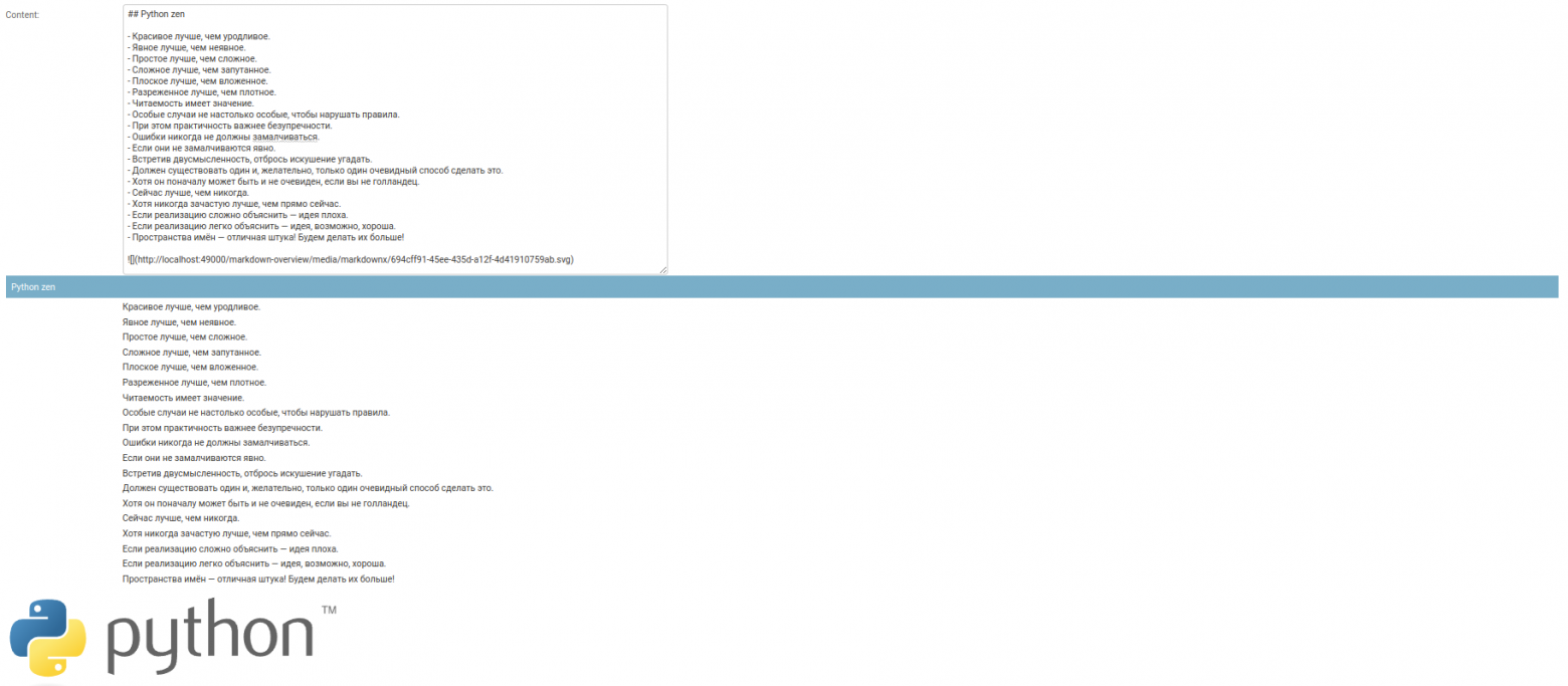 Поэтому тут каждый должен решать, что ему необходимо под конкретный кейс, я по итогу остановился на django-mdeditor.