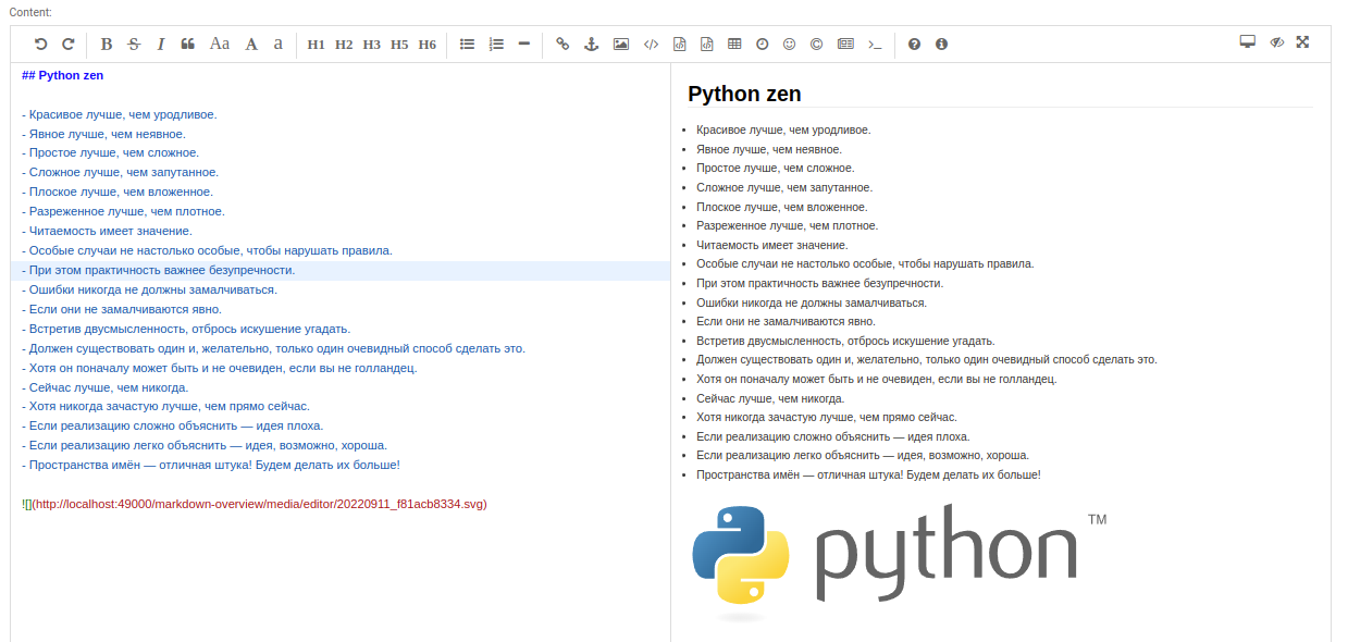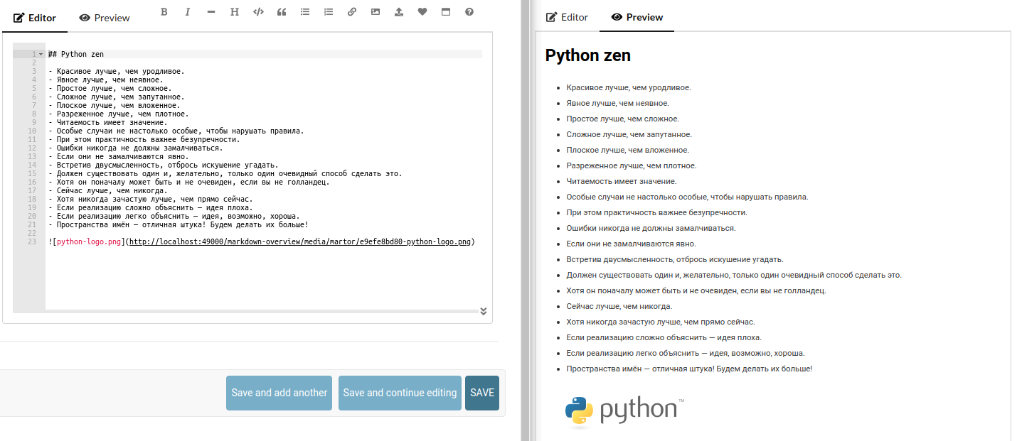 Поискав по закоулкам JavaScript, нашёл несколько markdown редакторов и через них вышел на интеграции в Django, но под наши требования подошли не все, рассмотрим один из них.